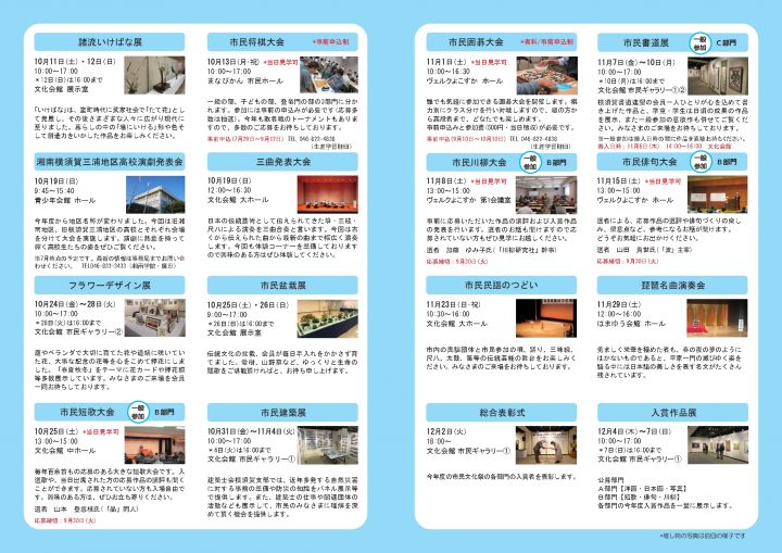 美術・写真音楽演劇・ダンス伝統芸能文化・歴史県民文化祭 横須賀市民文化祭 開催期間:2025年10月01日〜2026年01月31日開催中 イベント アクセス カレンダーへ登録 お問い合わせ 公式ホームページ 市民公募作品展、いけばな・盆栽・書道・フラワーデザイン・建築展、短歌・俳句・川柳大会、諸流派茶会、囲碁・将棋大会、三曲・詩吟・民謡・琵琶演奏会、演劇祭、入賞作品展、総合表彰式の 19 行事を開催します。 開催概要 日程 2025年10月01日(水曜日) - 2026年01月31日(土曜日) カレンダーへ登録 場所 横須賀市文化会館 他 出演概要 お問い合わせ まなびかん(横須賀市生涯学習センター) TEL:046-822-4838(8:30〜20:00) このイベントをカレンダーへ登録 × Google Calendar Apple + iCal
