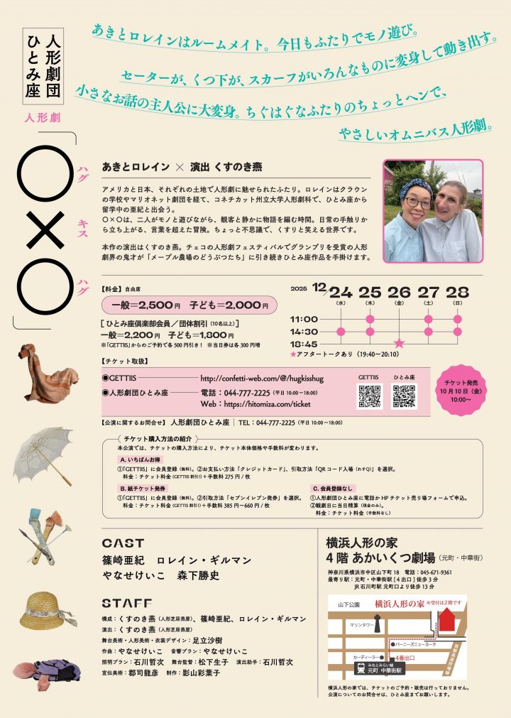 一般 2,500円/子ども(4歳~高校生)2,000円 <ひとみ座倶楽部会員・団体割引(10名以上)> ※GETTIISからのご予約で各500円引き GETTIISまたは人形劇団ひとみ座ホームページ/お電話からご予約ください。 |
