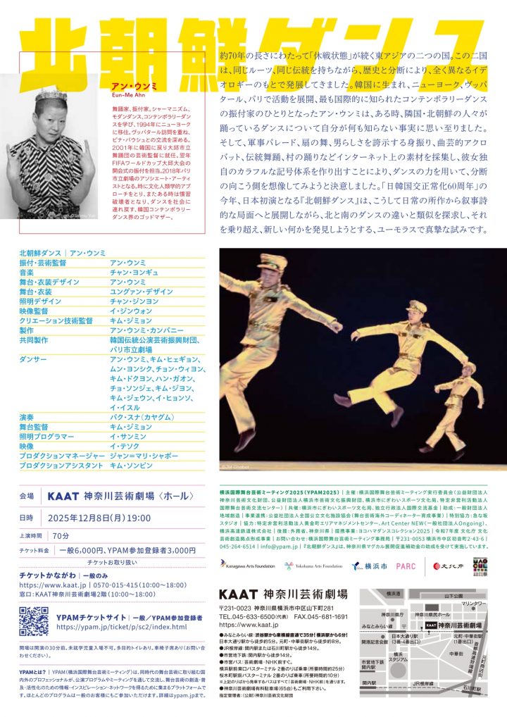 演劇・ダンス文化・歴史県民文化祭 北朝鮮ダンス KAAT 神奈川芸術劇場 開催日:2025年12月08日開催まであと44日 イベント アクセス カレンダーへ登録 お問い合わせ 公式ホームページ 開催概要 日程 2025年12月08日(月曜日) カレンダーへ登録 19:00開演(18:30開場) 料金 一般 6,000円/YPAM参加登録者 3,000円 チケットを入手する 場所 KAAT 神奈川芸術劇場 演劇、ミュージカル、ダンスなどの舞台芸術専用の施設。2021年4月より、芸術監督に、劇作家・演出家・俳優の長塚圭史を迎え、街に「ひらかれた」劇場を目指し、演劇、ミュージカル、ダンスなどの優れた舞台芸術作品を創造・発信しています。 施設について アクセス このイベントをカレンダーへ登録 × Google Calendar Apple + iCal