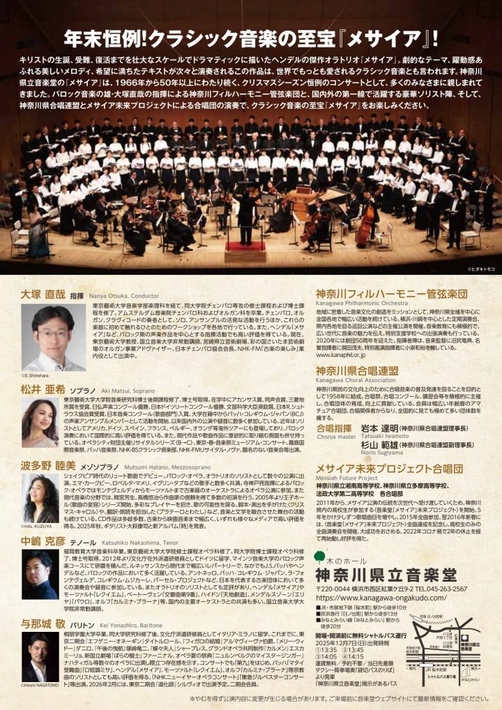 | 演员 | 指揮:大塚直哉 ソプラノ:松井亜希 <神奈川フィルハーモニー管弦楽団> 合唱:神奈川県合唱連盟/音楽堂「メサイア」未来プロジェクト合唱団 |