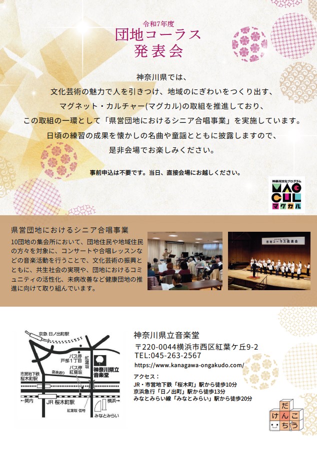 神奈川県では、文化芸術の魅力で人を引きつけ、地域のにぎわいをつくり出す、マグネット・カルチャー(マグカル)の取組を推進しており、この取組の一環として、県内10団地において、令和4年度より「県営団地におけるシニア合唱事業」に取り組んでいます。