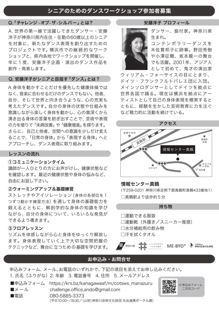 演劇・ダンス講座・ワークショップその他 招募老年舞蹈工作坊参与者 開催日:2026.03.05開催まであと22日 活动 使用权 登录至行事曆 询问 公式ホームページ 共存与共创:银发族在马纳祖鲁面临的商业挑战招募老年舞蹈工作坊参与者 活动简介 时间表 2026.03.05(周四) 登录至行事曆 13:00~15:00(受付開始 12:30) 价格 1,000円(税込、事前予約) ※真鶴町初開催 特別価格! <対象> 神奈川県在住・在勤の60歳以上の方 ※経験不問 获得门票 地方 真鶴町 情報センター真鶴 (足柄下郡真鶴町真鶴433番地) このイベントをカレンダーへ登録 × Google Calendar Apple + iCal