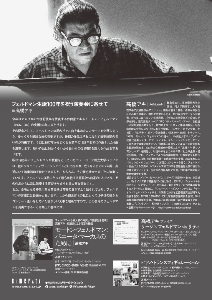 2026년에 탄생 100년을 맞이하는 모튼 펠드만 작곡에 의한 피아노 작품을, 펠드만과 깊은 친교가 있던 피아니스트 타카하시 아키가 듬뿍 연주합니다.