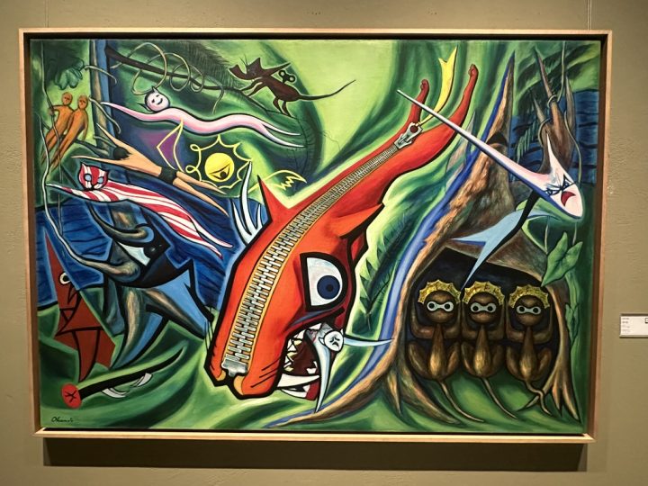 そして《森の掟》の対面には、同じく対極主義の代表作《重工業》が。《森の掟》の前年(1949年)に描かれたこの作品も、“写実的な歯車”とその周りを囲む“抽象的な人”、さらにその下には“写実的なネギ”と、対極を描きながら、社会風刺も含んでいる。