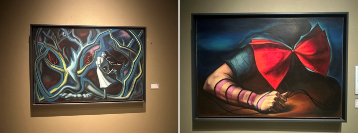(左)《夜》(1947年)落雷で裂かれた木を前に、少女がナイフを後ろ手にもちながら佇んでいる。(右)《傷ましき腕》(1936年)抽象表現に限界を感じていた太郎がシュルレアリスム(超現実主義)に影響を受けて描いた。リボンでがんじがらめになっている様は太郎自身がモデルではないかといわれている。