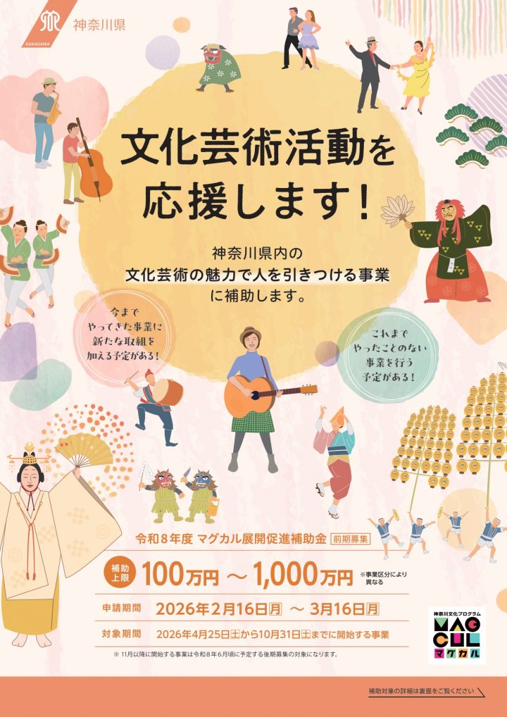 神奈川縣正在推行「磁力文化(Magcul)」計劃,旨在以文化藝術的魅力吸引民眾,打造充滿活力的社區。為促進「磁力文化」的發展,縣政府將在預算範圍內為民間團體所進行的新文化藝術計畫提供必要的費用補助。