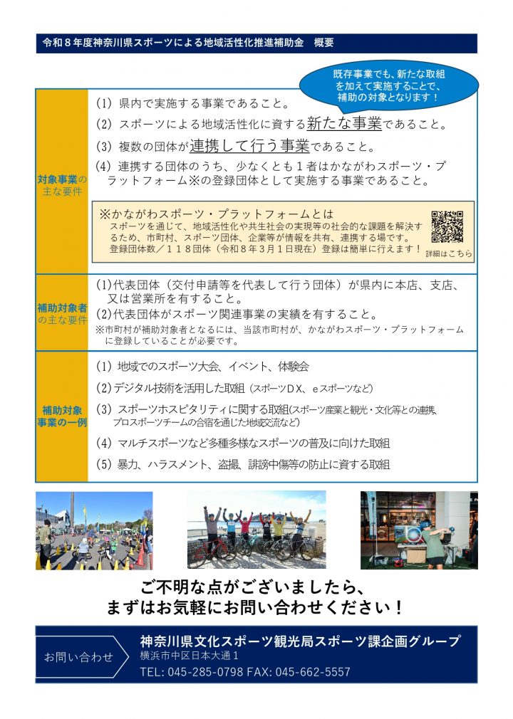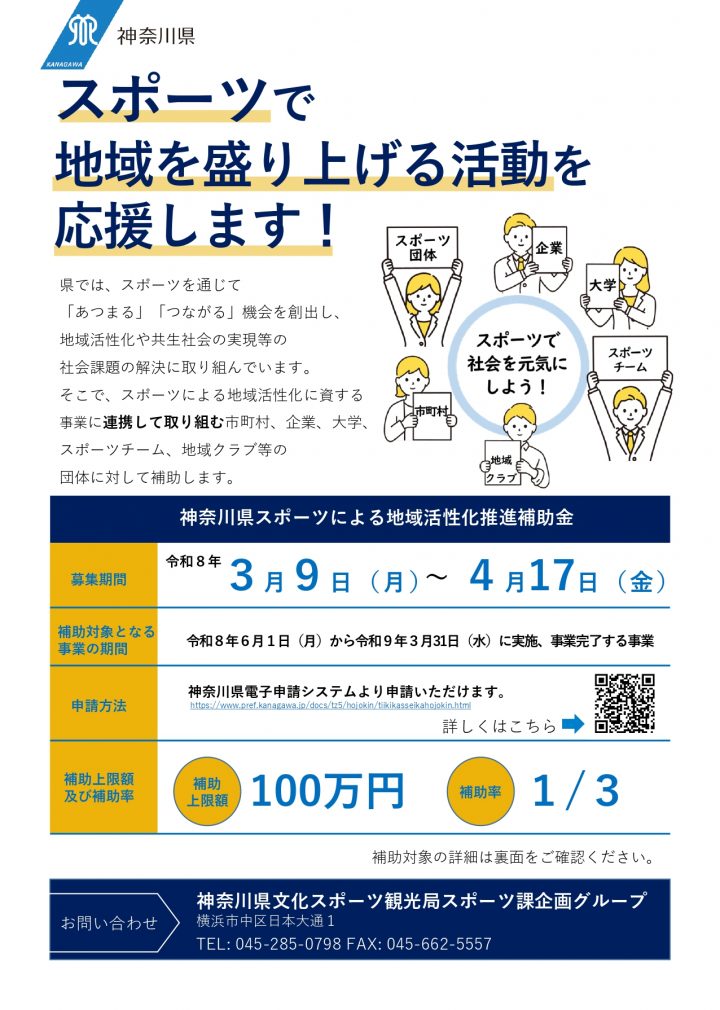 The prefecture is working to create opportunities for people to "gather" and "connect" through sports, and to solve social issues such as revitalizing the local community and realizing a symbiotic society. Therefore, the prefecture will provide subsidies within the budget to organizations that work in collaboration with the prefecture on projects that contribute to promoting local revitalization through sports.